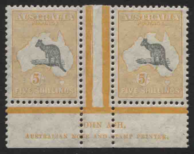 5/- grey and yellow ASH imprint pair. Right stamp with OPEN MOUTH ROO variety. Both stamps are mint unhinged, (light hinge in base of selvedge).