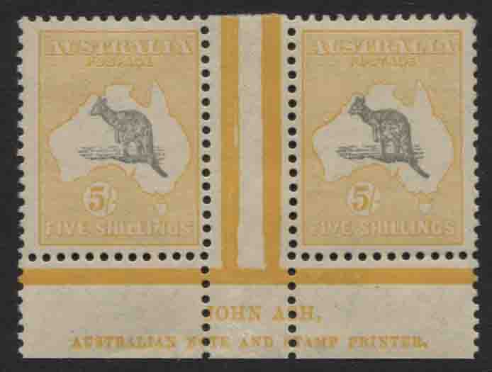 5/- grey and yellow ASH imprint pair. Right stamp with OPEN MOUTH ROO variety. Extra fine, mint lightly hinged.