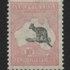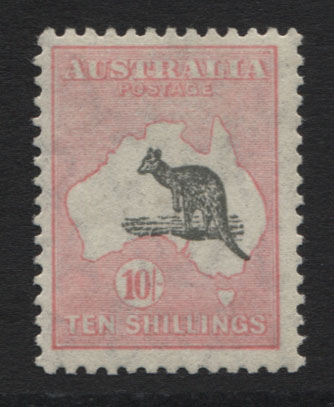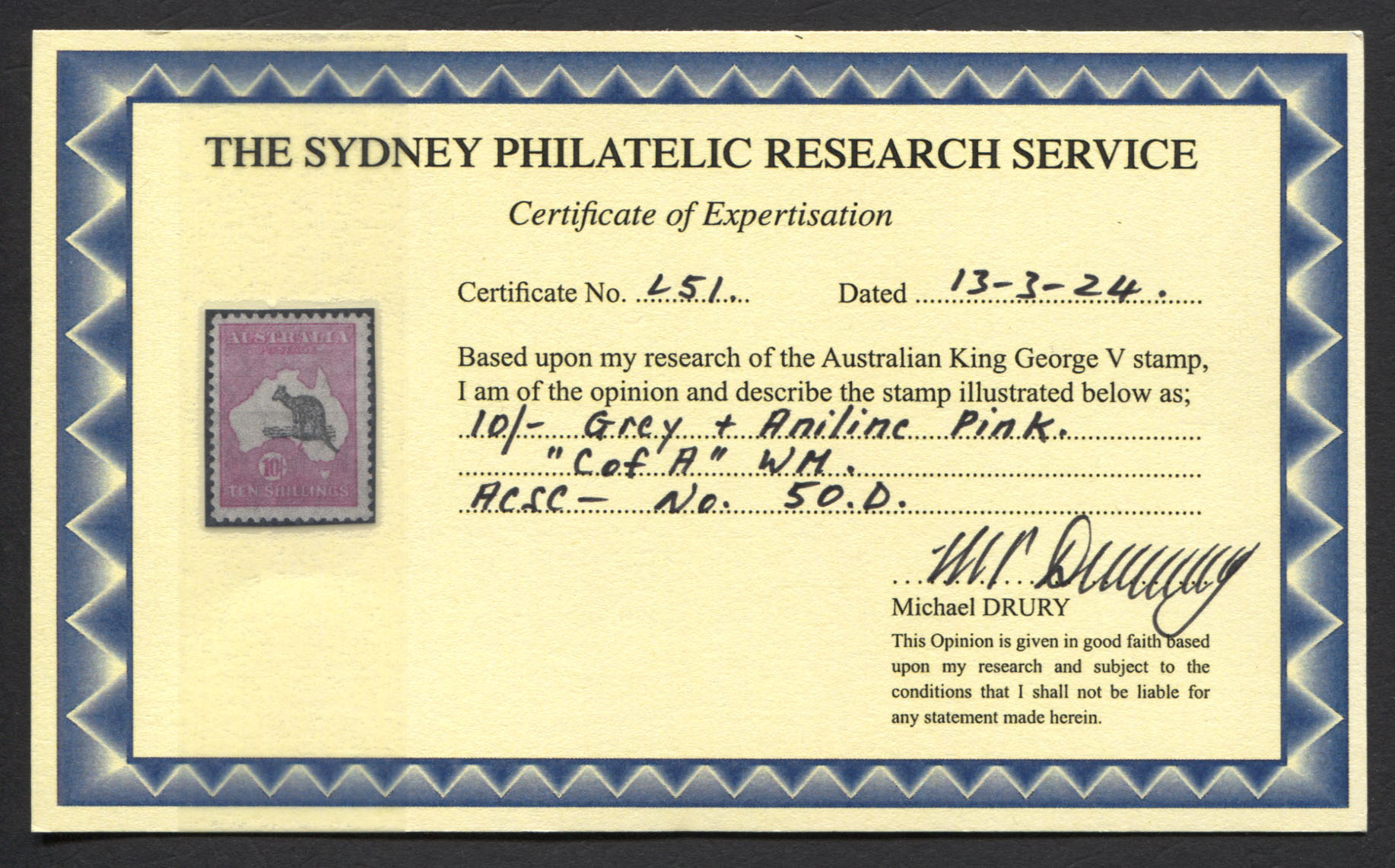 C of A wmk 10/- grey and ANILINE pink. Nicely centred and bright colouring. Very...