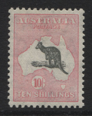 C of A wmk 10/- grey and ANILINE PINK. Variety: WEEPING KANGAROO. DRURY shade CERTIFICATE. Mint lightly hinged.