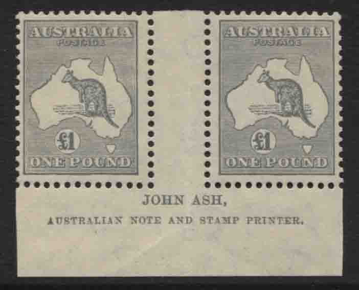 £1 grey ASH IMPRINT pair. Super fresh, with both stamps being mint lightly hinged. Nicely centred for an imprint pair. VERY SCARCE.