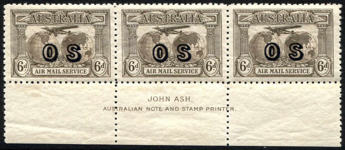 6d Airmail OS overprint. ASH imprint strip of 3. All stamps are mint unhinged.$175.00 -
