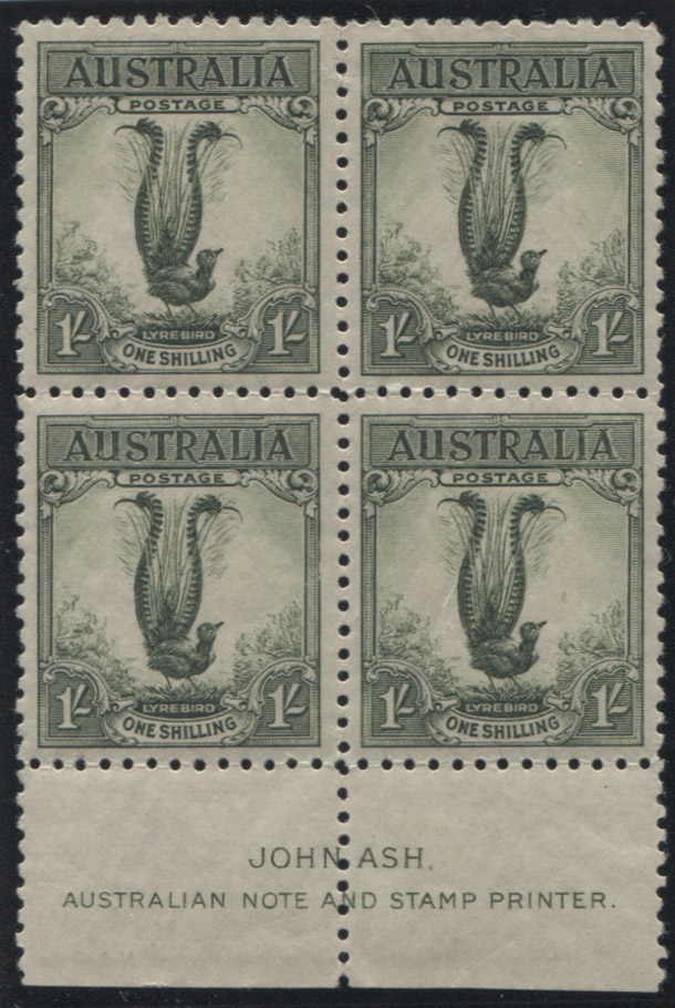 1/- Lyrebird, ASH IMPRINT block of 4. 3