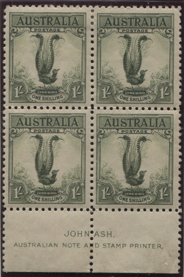 1/- YELLOW-GREEN Lyrebird, ASH IMPRINT block of 4. 2