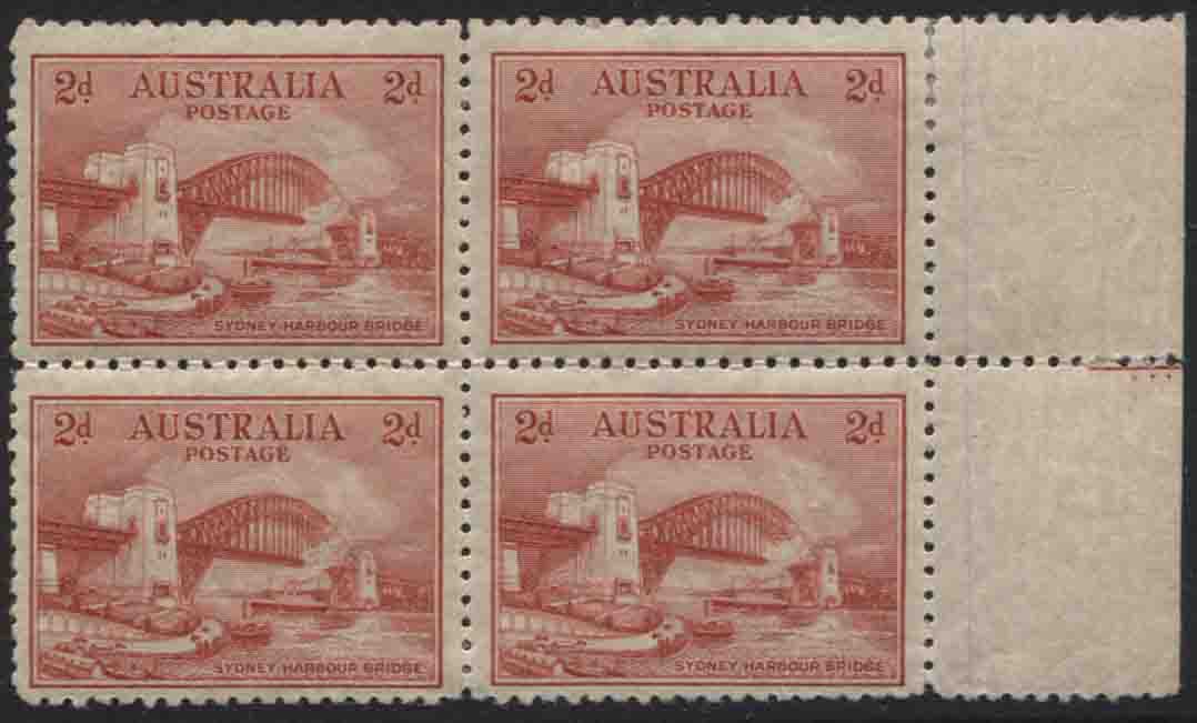 Sydney Harbour Bridge. 2d Engraved, vertical mesh paper. Block of 4 with 4 PLATE DOTS at right. Extra fine, all stamps are mint unhinged. RARE.