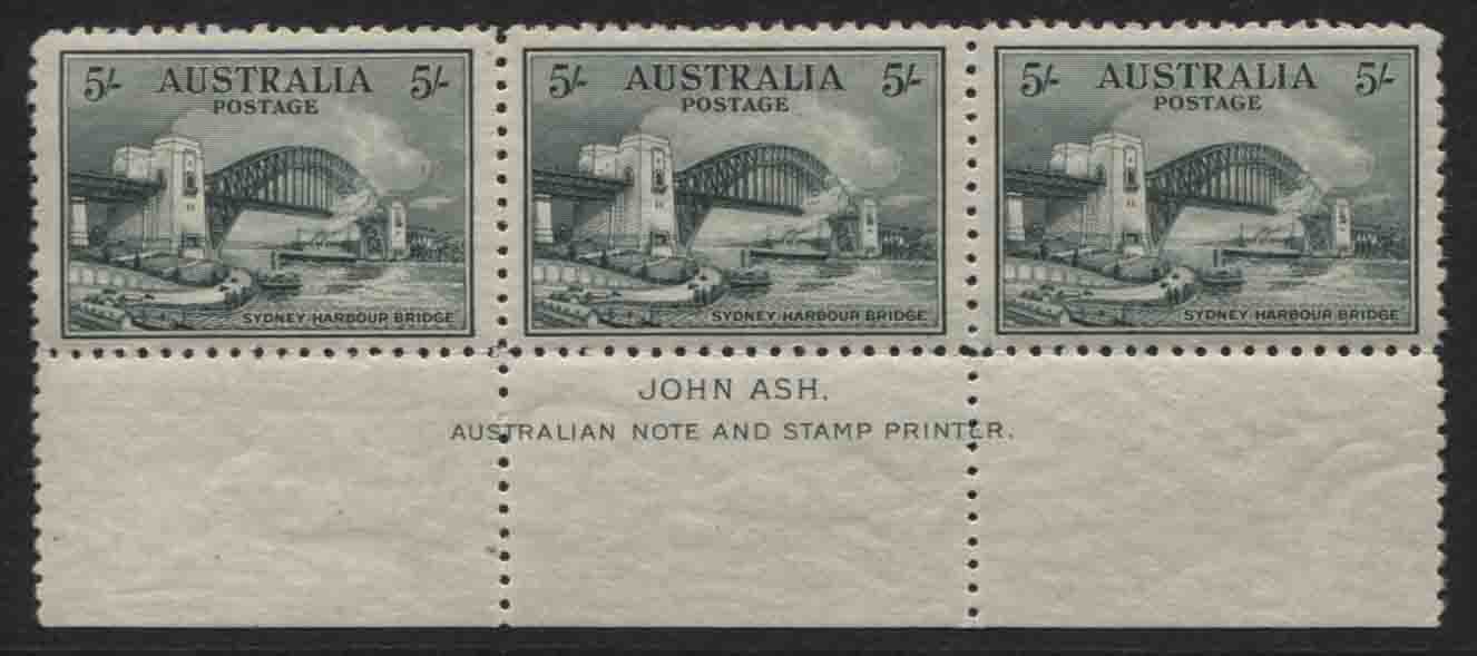 Sydney Harbour Bridge 5/- green, ASH imprint strip of 3. Very fresh and good centring. All stamps are mint lightly hinged. Attractive.