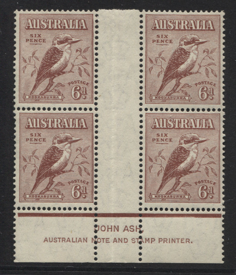 6d kookaburra, ASH imprint block of 4. PLATE No 1 (margin line 1mm thick). 2 mint unhinged/ 2 mint lightly hinged.