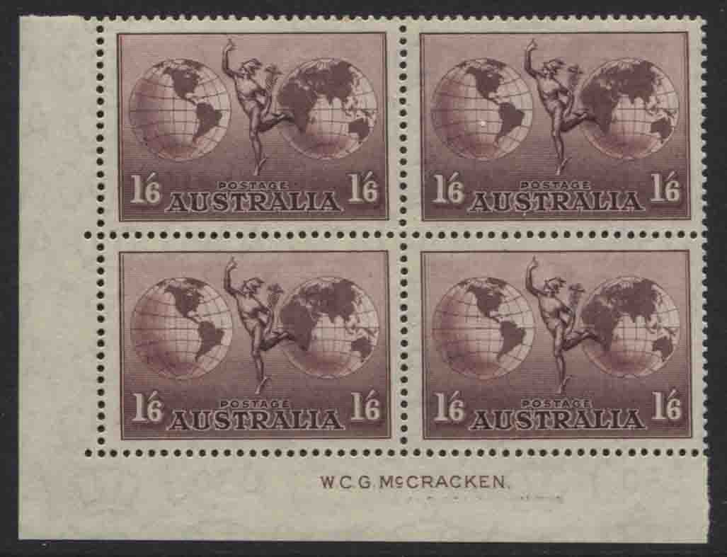 1/6 Hermes, thin paper. McCracken imprint corner block of 4 with 90% of BOTTOM LINE MISSING. VERY SCARCE. Totally mint unhinged.