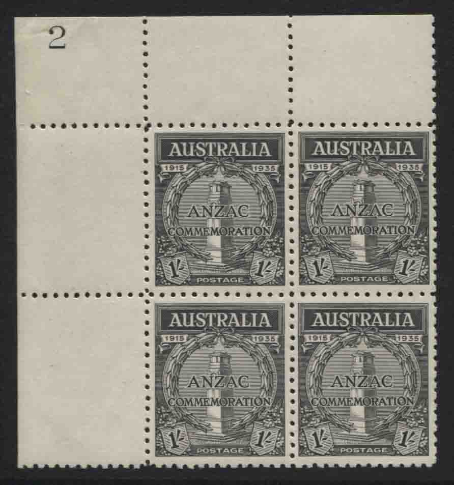 ANZAC 1/- black corner block of 4, PLATE No 2. Choice, all stamps are mint unhinged (very light hinge mark in upper selvedge only).