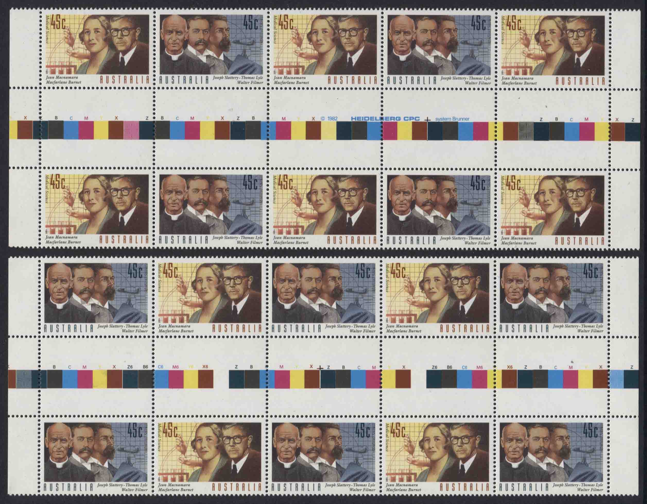 45¢ Medical Scientists gutter blocks of 10. Gutter pairs containing two examples of the same stamp, rather than se-tenant pairs, were withdrawn prior to release – some “escaped”. Mint unhinged.