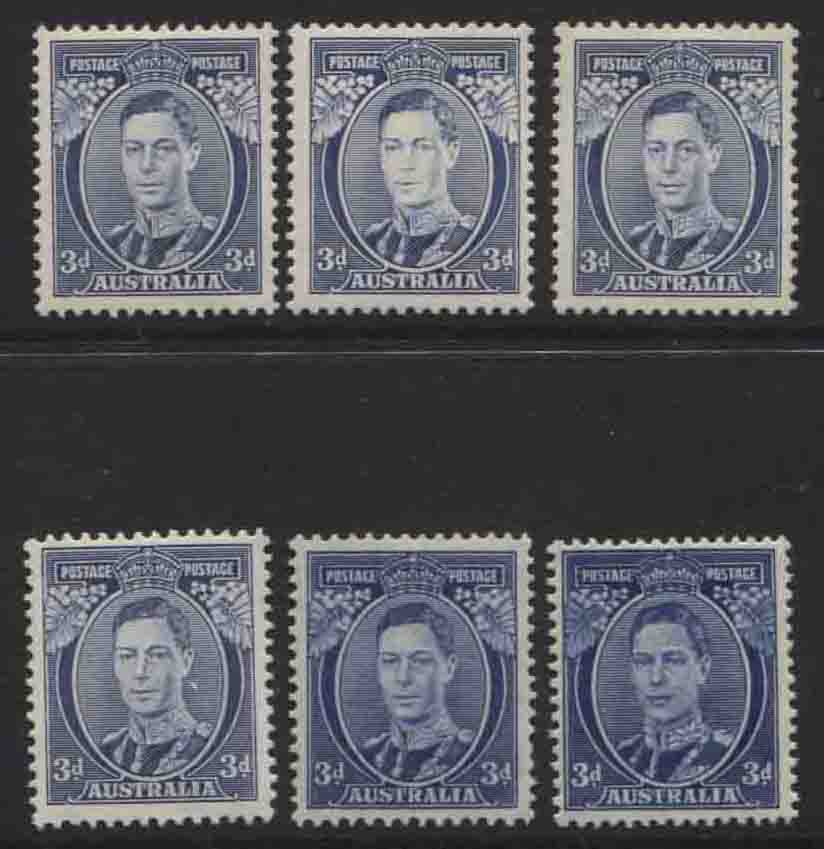 3d blue group of 6 stamps covering all die variants listed in SG catalogue. Select mint unhinged.