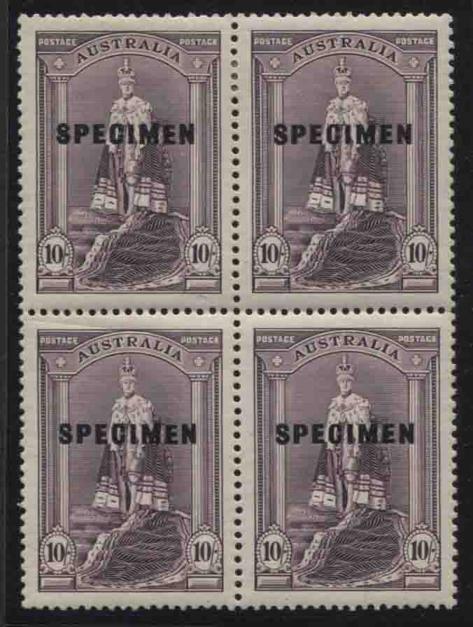 10/- dull purple, Ash printing overprinted specimen in a block of 4. Three stamps are hinged, one is mint unhinged. A scarce and attractive block.