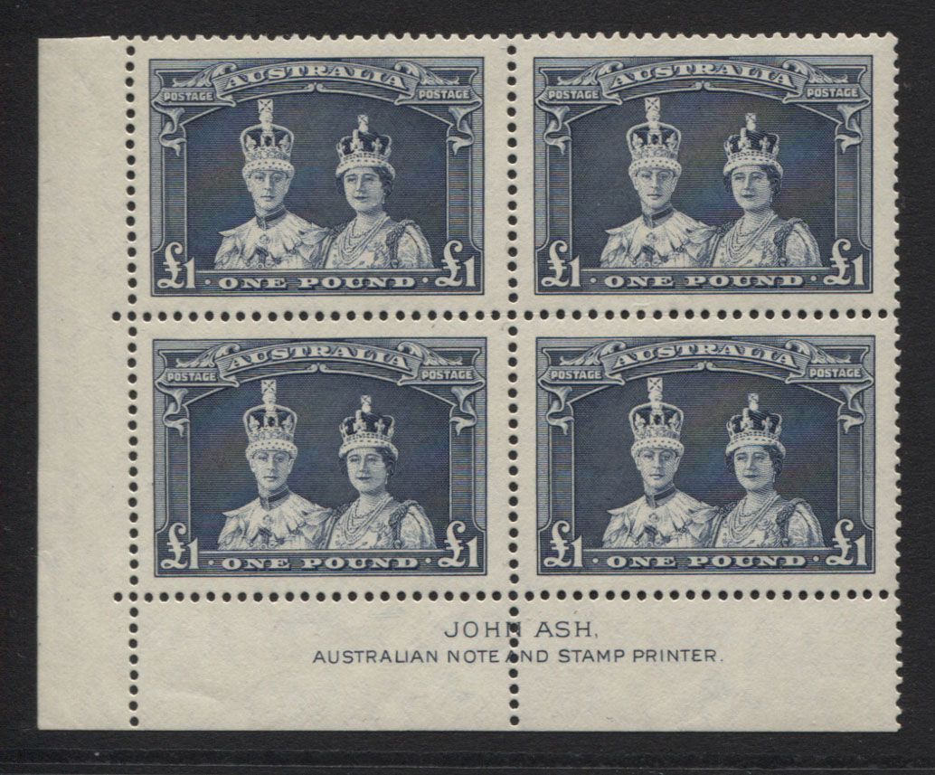 ROBES £1 dull blue, thick paper. ASH imprint corner block of 4. All stamps are mint unhinged (light hinge touch in selvedge).