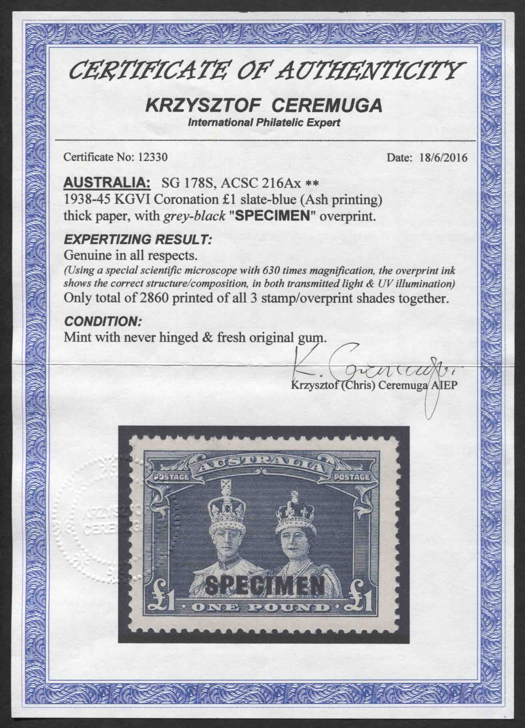 ROBES £1 SPECIMEN overprint. ASH printing with grey-black overprint. Ceremuga Certificate. Extra fine, mint unhinged.