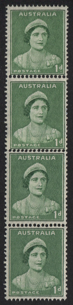 QE 1d green, die 2 COIL strip of 4, with coil join (uniformly large perforation holes). Extra fine, mint unhinged.
