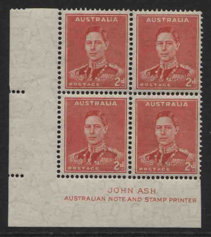2d scarlet, die 2 COIL PERF (large holes) ASH imprint corner block of 4. RPS (Vic) Certificate. RARE. Extra fine, mint unhinged.