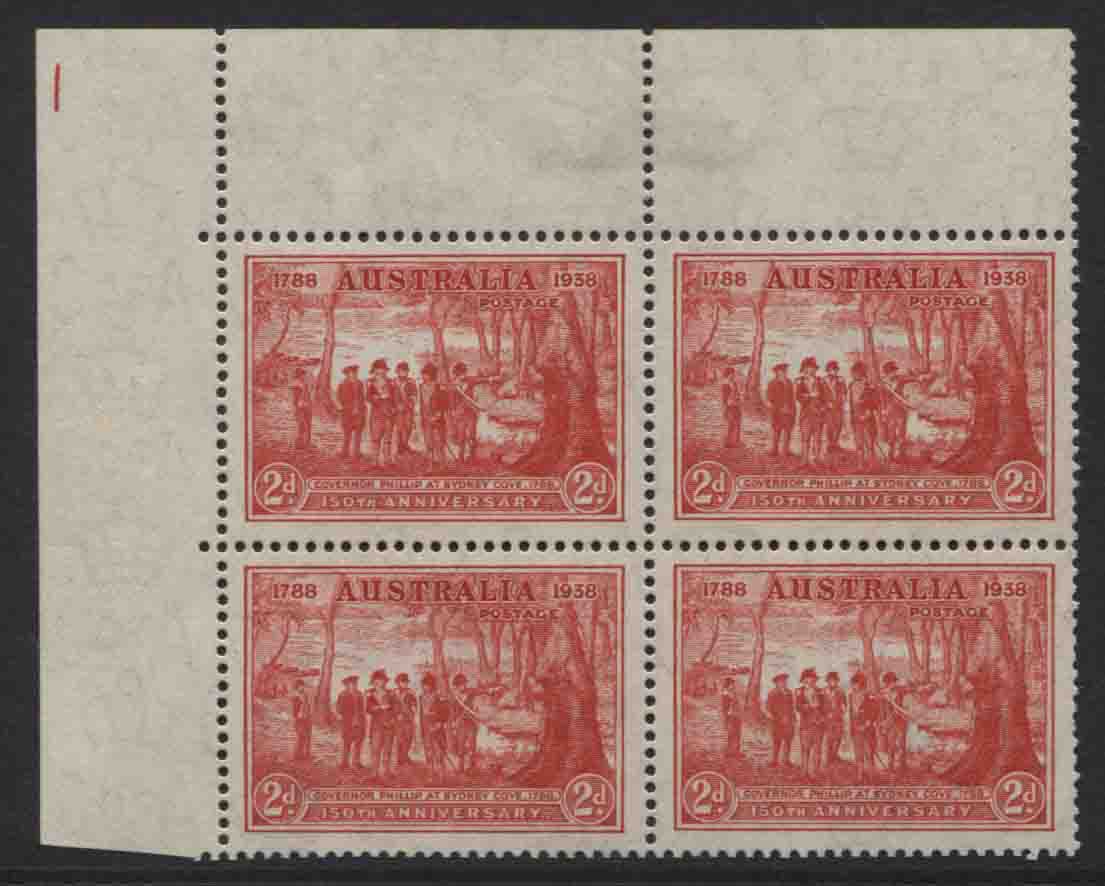 NSW Sesqui 2d scarlet (type B). Upper left corner block of 4, with PLATE No 1 in selvedge. 2 mint hinged/ 2 mint lightly hinged.
