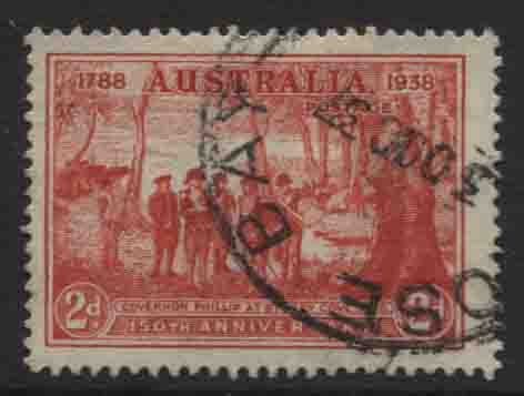 NSW Sesqui 2d scarlet. PANTALOON flaw RETOUCHED, STATE I. A fine used, dated example of this scarce variation.