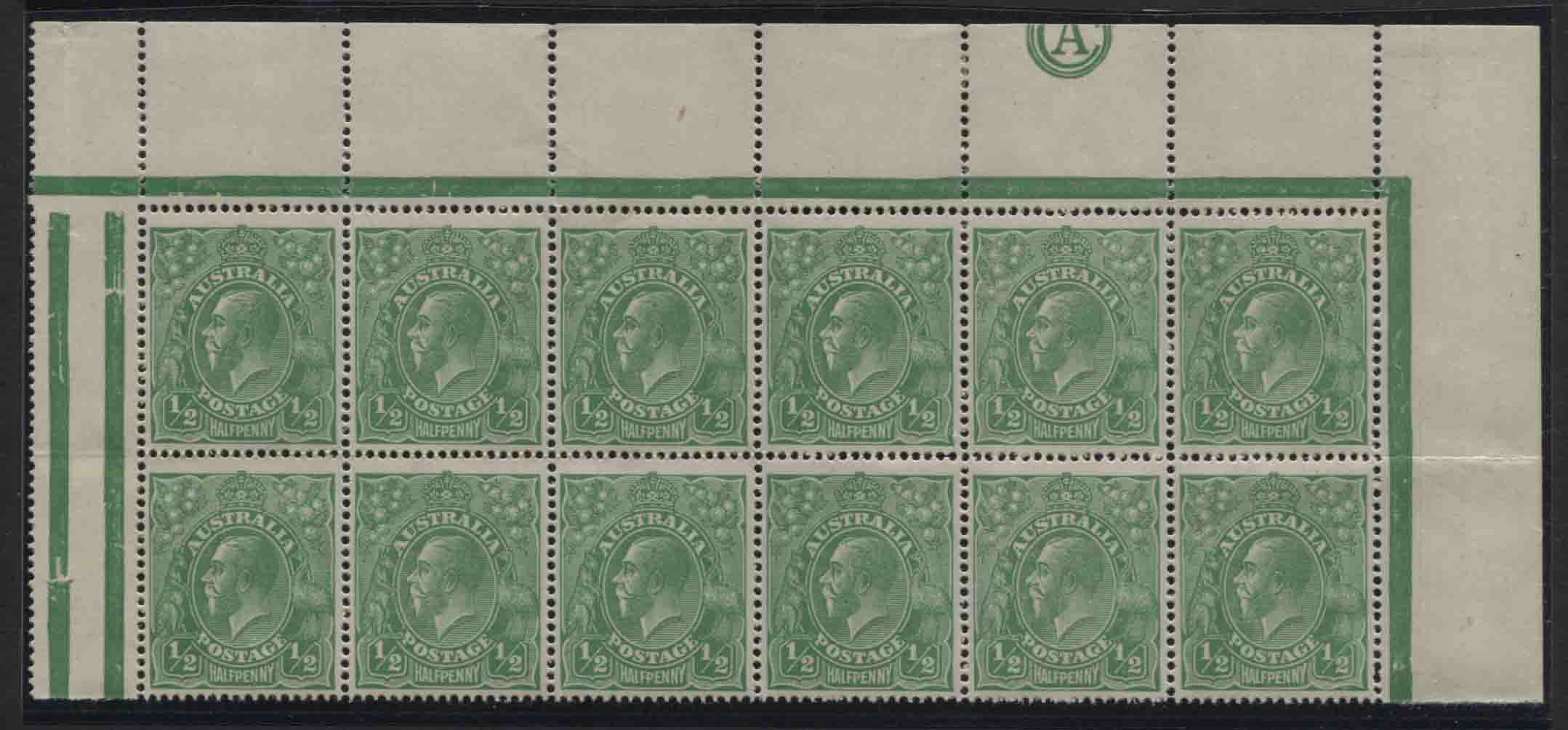 Single wmk, ½d emerald green, PLATE 2. CA MONOGRAM in top selvedge due to misalignment of perforation process. SCARCE, few such items survive showing a large proportion of the monogram. Mint unhinged.
