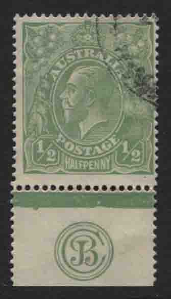 Single wmk, ½d pale green, JBC monogram single, Electro 2. Fine used.