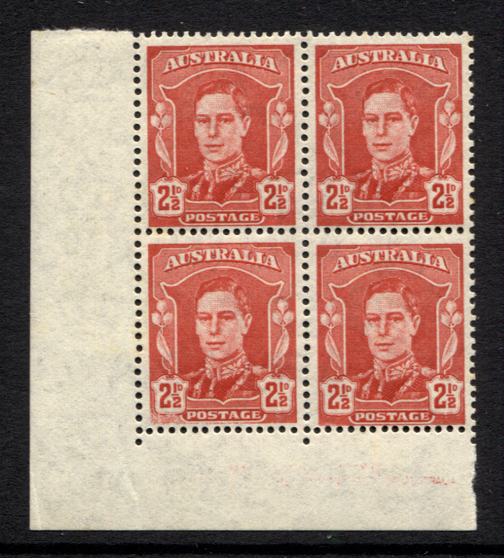 2½d, NO IMPRINT lower left corner block of 4. Slight remainder of imprint evident at bottom right, as usual. Totally mint unhinged.