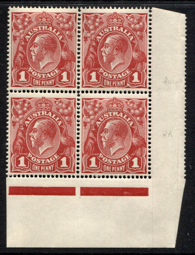 Single wmk, smooth paper. 1d carmine block of 4 showing varieties: FERNS and RA JOINED (without imprint). Extra fine, mint lightly hinged.