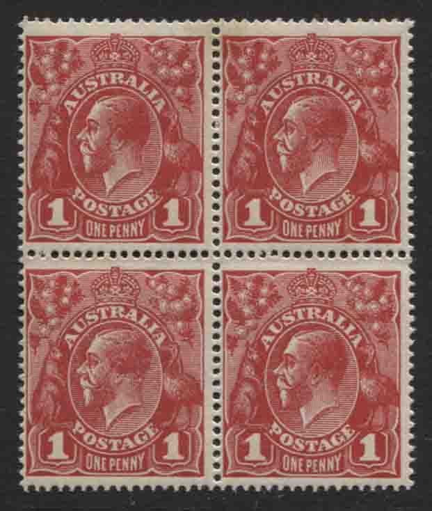 Single wmk, smooth paper. 1d carmine-red, die 2 block of 4. VERY SCARCE. 3 mint unhinged/ 1 mint very lightly hinged. All stamps with a pronounced ‘spur’.