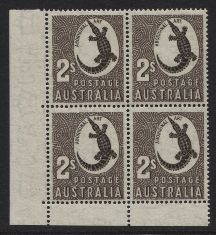2/- Crocodile, C of A wmk. NO IMPRINT corner block of 4. Extra fine, totally
