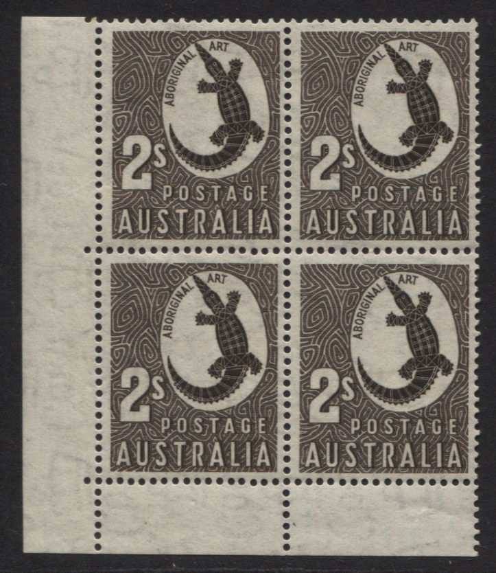 2/- Crocodile, C of A wmk. NO IMPRINT corner block of 4. Extra fine, totally