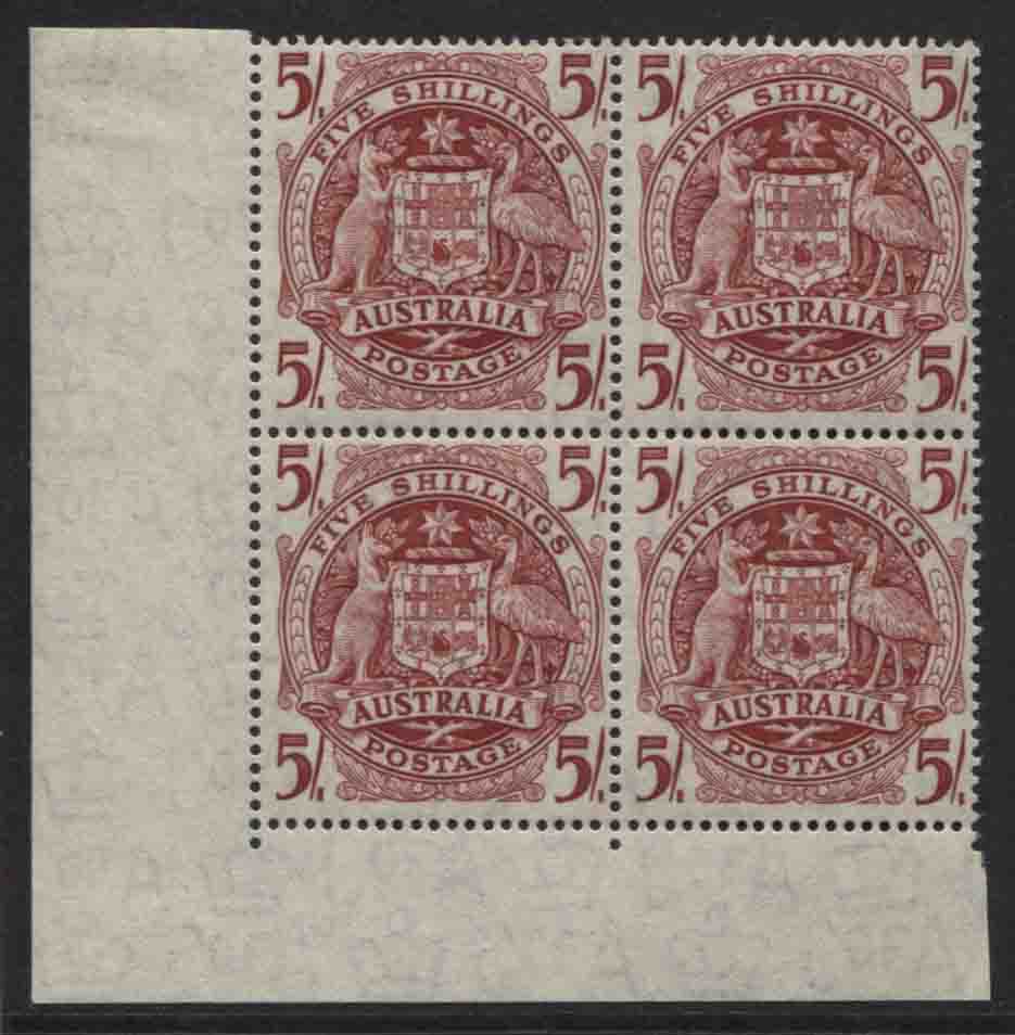 5/- carmine, NO IMPRINT, corner block of 4. Extra fine, totally