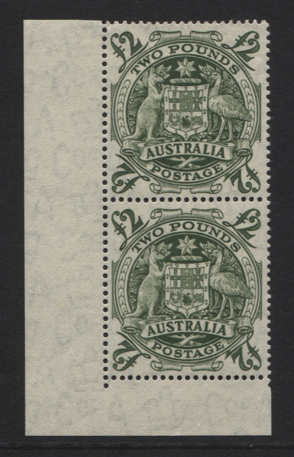 ARMS £2 green. A vertical NO IMPRINT corner pair with both units having ROLLER FLAW variety. Extra fine, totally mint unhinged.