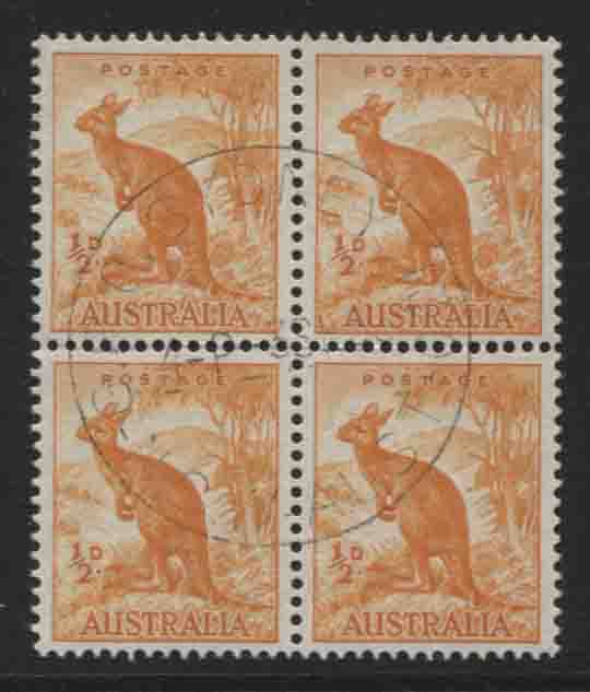 Roo ½d orange coil perf block of 4, cancelled to order “SYDNEY GPO”. Very fine.