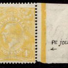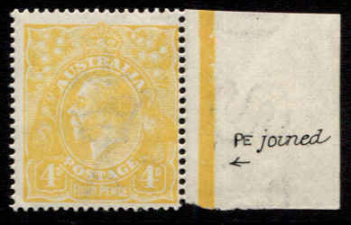 KGV Single wmk 4d LIME LEMON shade. Very fresh, centred to right. Variety: PE JOINED. Mint unhinged. DRURY CERTIFICATE.