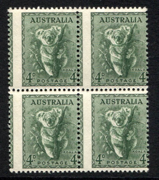 4d koala, no wmk. A block of 4 showing MISPLACED PERFORATIONS 3mm to left.