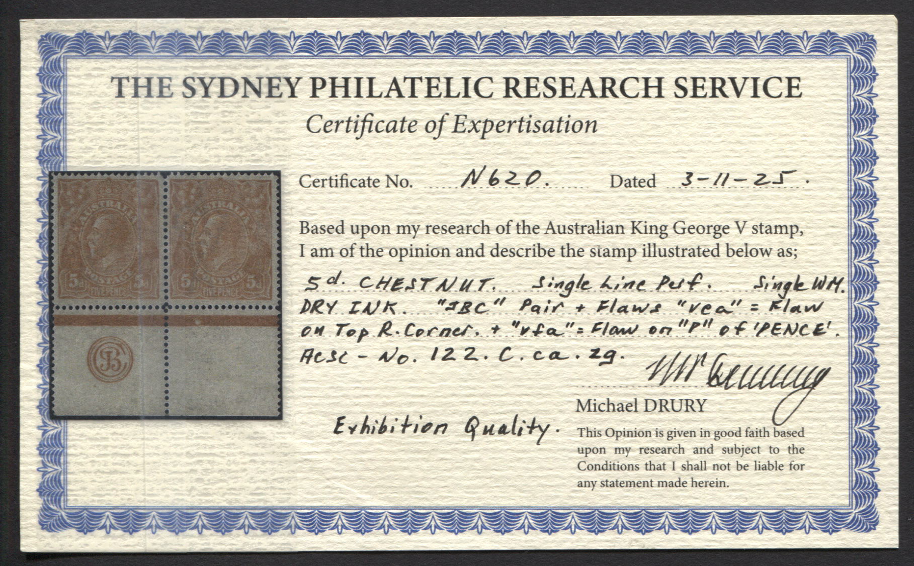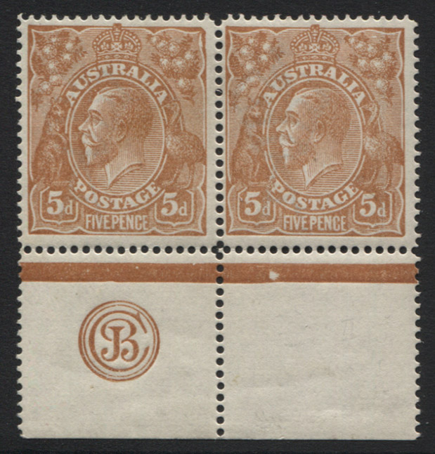 Single wmk, single line perf, 5d pale chestnut. A JBC monogram pair exhibiting DRY INKING.