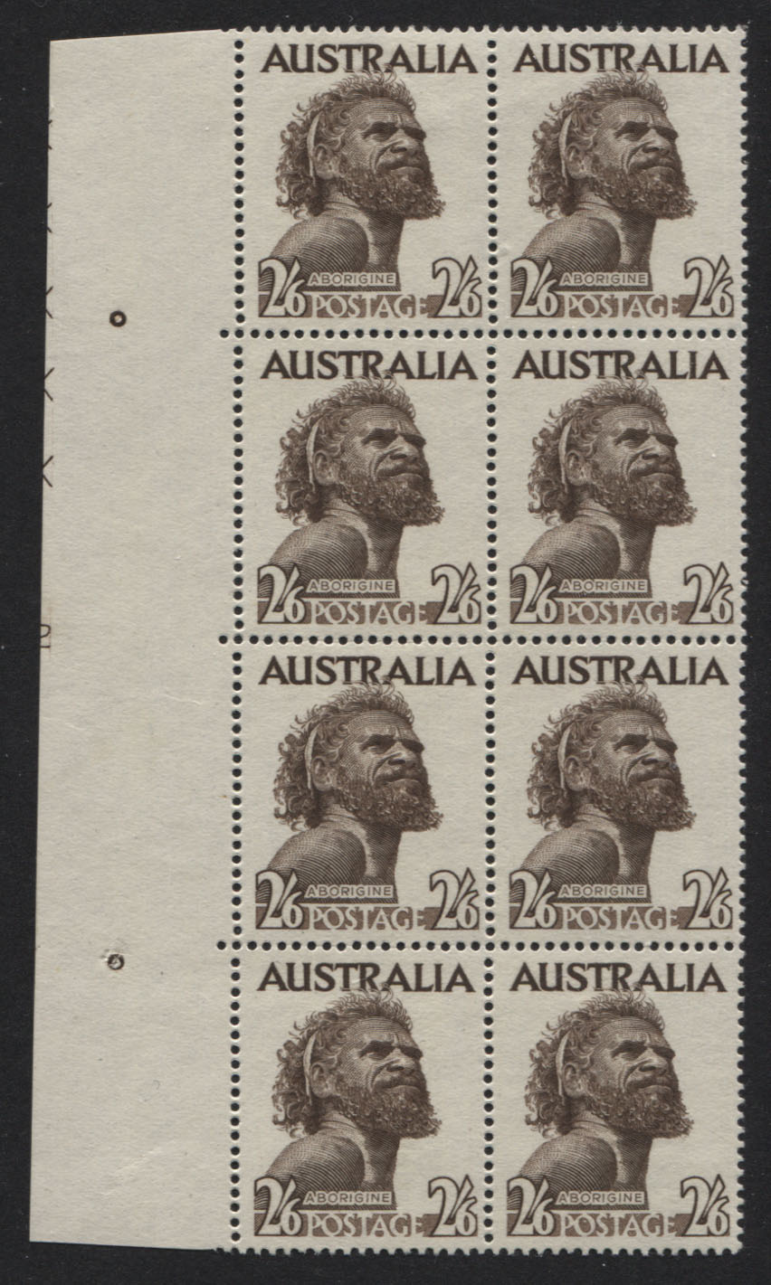 2/6 Aborigine, NO WMK. PLATE No. 2 (at left) block of 8. Extra fine and very scarce with only several examples known. Super fresh, 4 mint unhinged/ 4 mint lightly hinged. RARE.