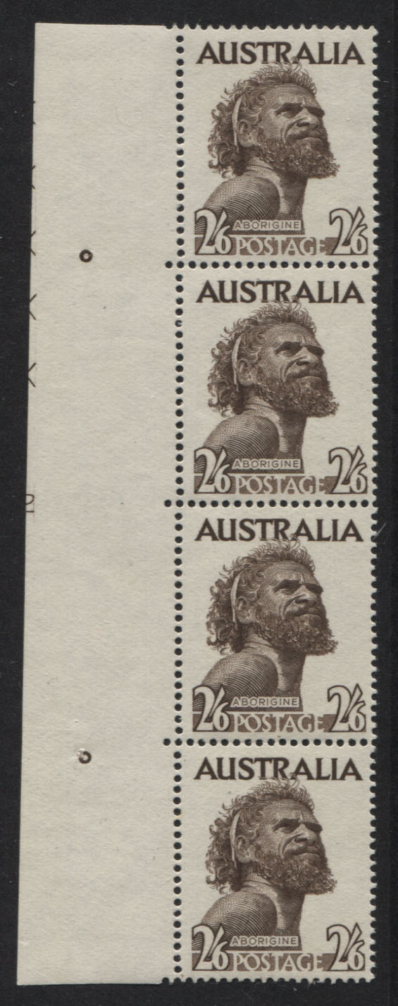 2/6 Aborigine, NO WMK. PLATE No. 2 (at left) strip of 4. Extra fine and very scarce with only several examples known. Lower 3 stamps are mint unhinged and top stamp is mint very lightly hinged.
