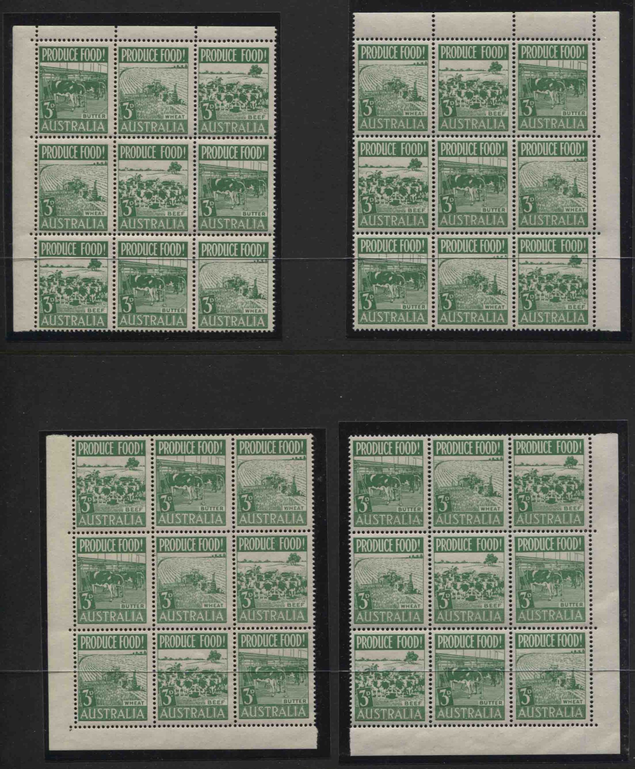 Food Produce 3d green, all four corner blocks of 9. Mint unhinged. A difficult to find grouping.