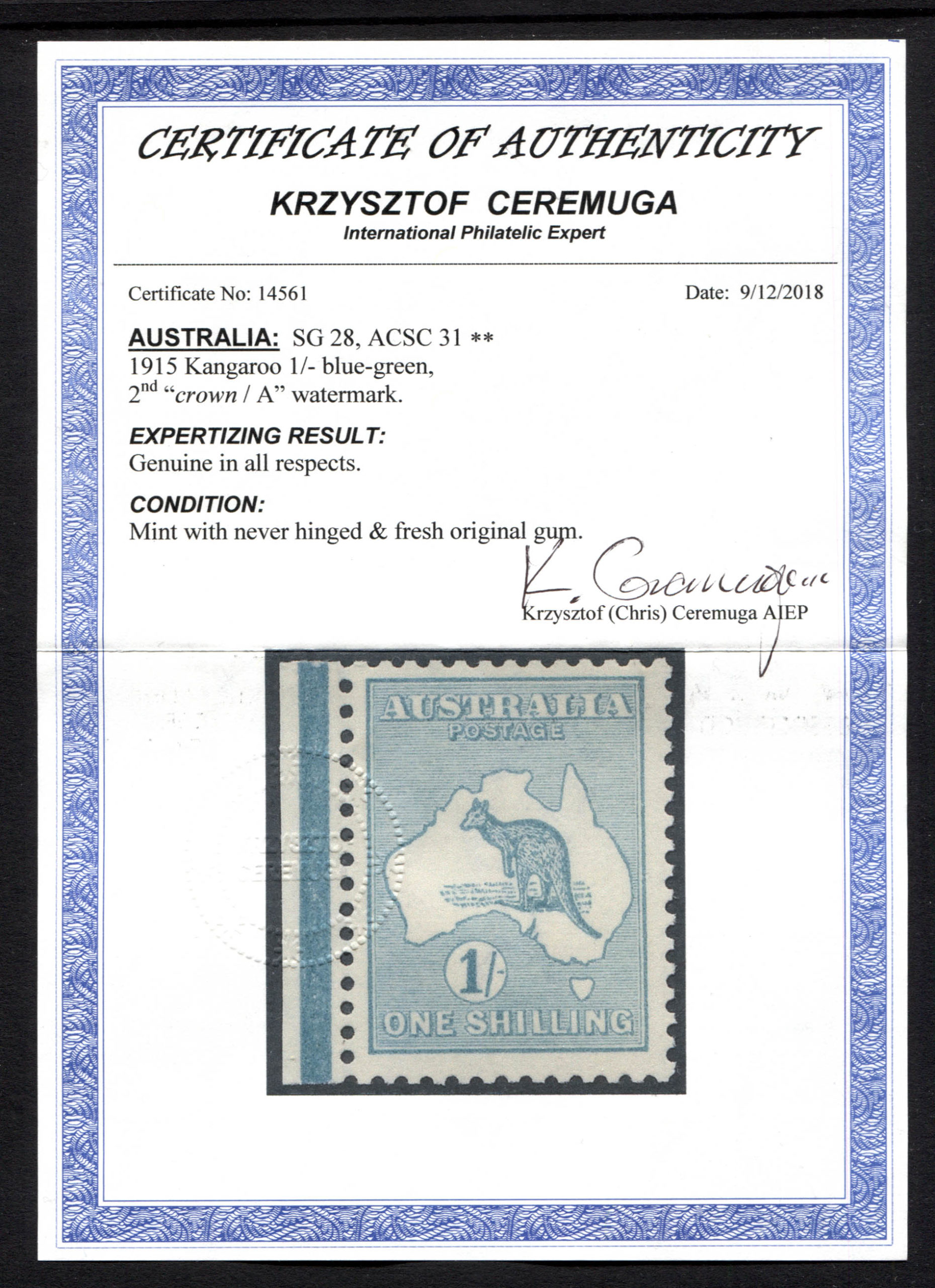 1/- blue-green. Ceremuga Certificate. Very fresh and fine,