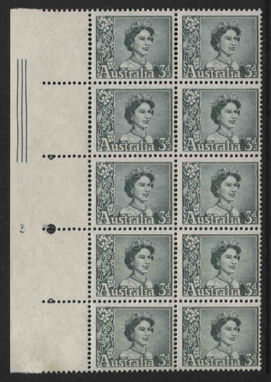 3d blue-green COIL PERF, PLATE No 3 at left (no dashes), block of 10. Mostly