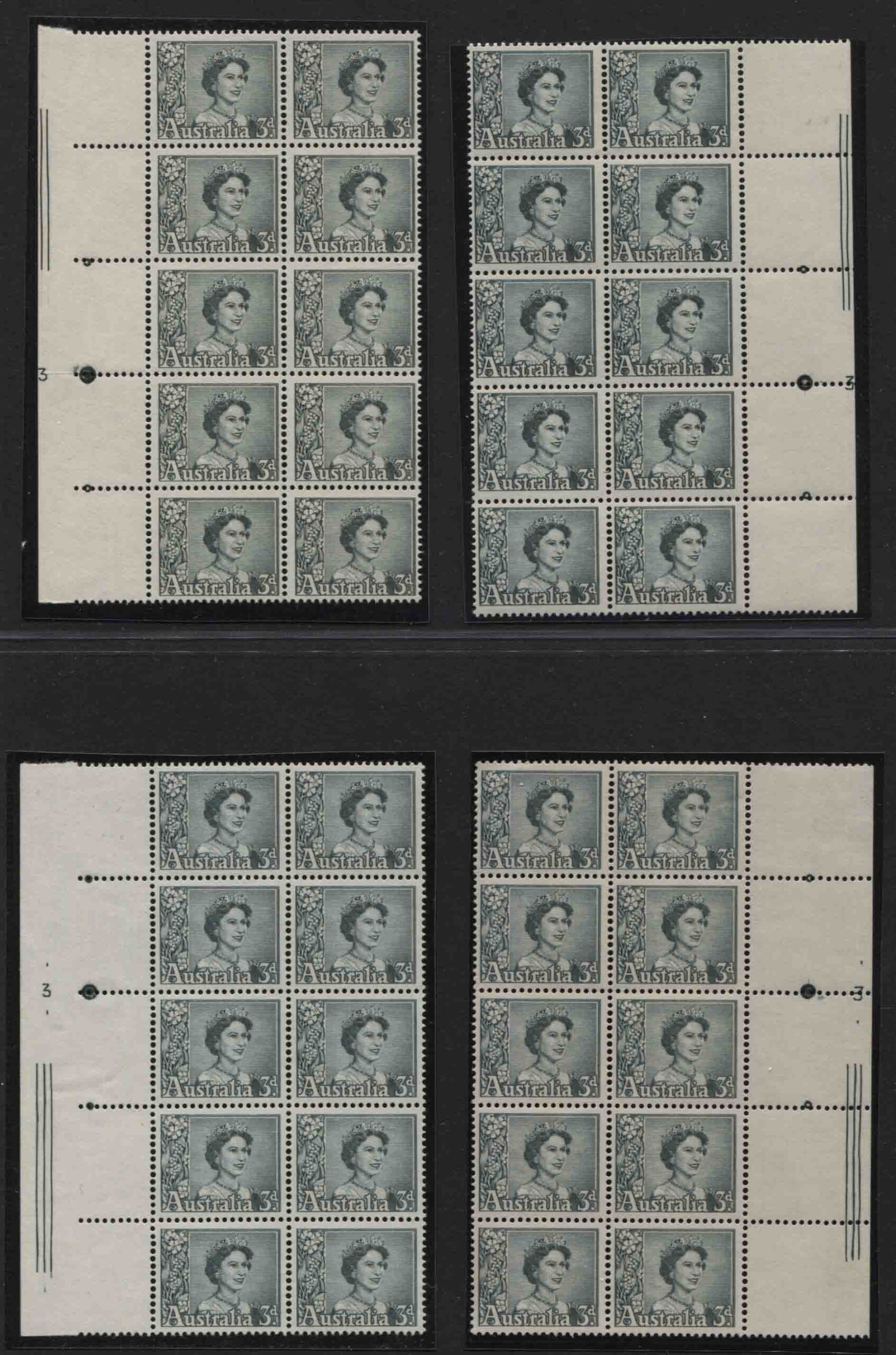 3d blue green, QEII PLATE 3, at LEFT and RIGHT, with and without dashes. Rarely seen as a complete set of 4, positional blocks of 8. Mint unhinged.