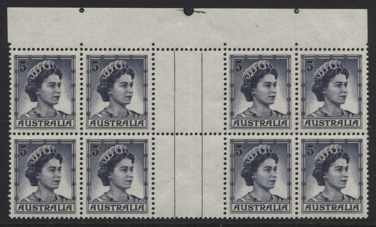 5d blue gutter block of 8 with PIP FRACTURE in upper selvedge. ELECTRO A “I”, early state. Mint lightly hinged in upper selvedge only.