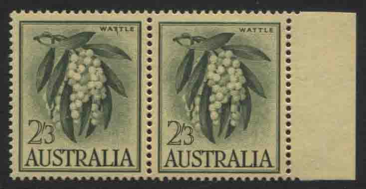 2/3 Wattle on yellow paper. A horizontal pair. First stamp with the VERY SCARCE variety OBLIQUE LINE THROUH FIRST ‘T’ of ‘WATTLE’. (ACSC $575). Totally mint unhinged.
