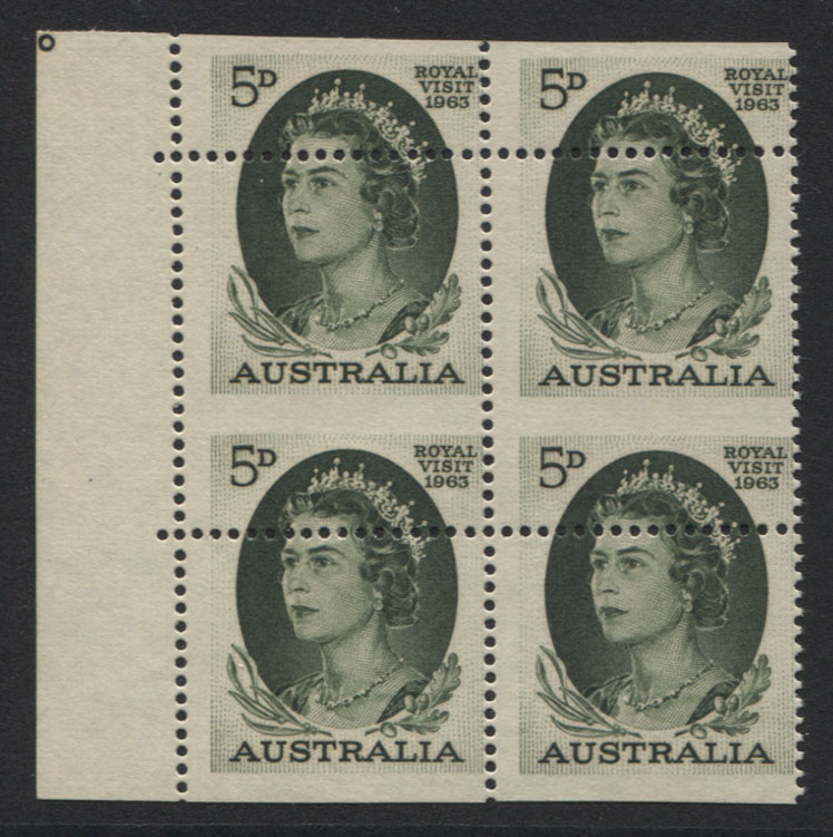 ROYAL VISIT 5d green. A block of 4 with greatly misplaced perforations. Extra fine, mint unhinged.
