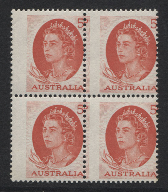 QEII 5d red-helicon ink and helicon coating on reverse. MISPLACED PERFS block of 4. Extra fine, mint unhinged.