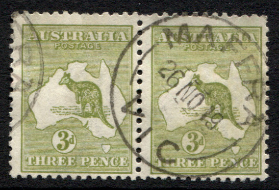 3d olive-green, DIE 2, horizontal pair. Left unit has a fibre inclusion. Good used.