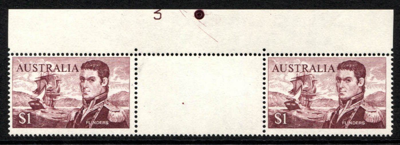 $1 Flinders, perf 15 x 14. Plate number gutter pair with No. 3 in upper selvedge. Totally mint unhinged.