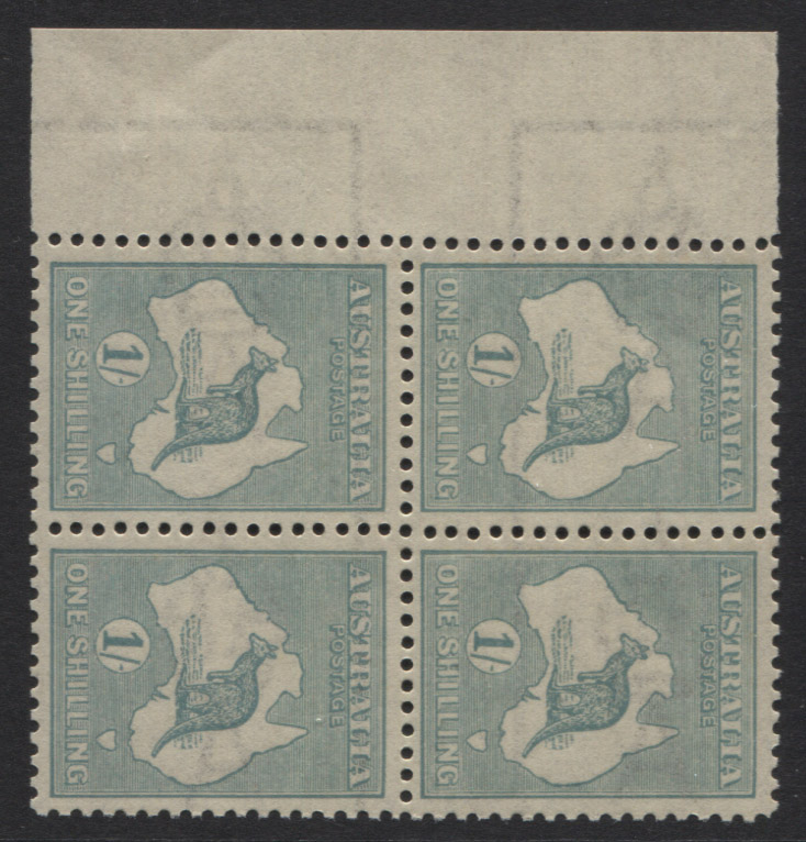 1/- green, die 2B with watermark SIDEWAYS. A very fine block of 4, with watermark identifying central gutter position. Very fine, mint unhinged.