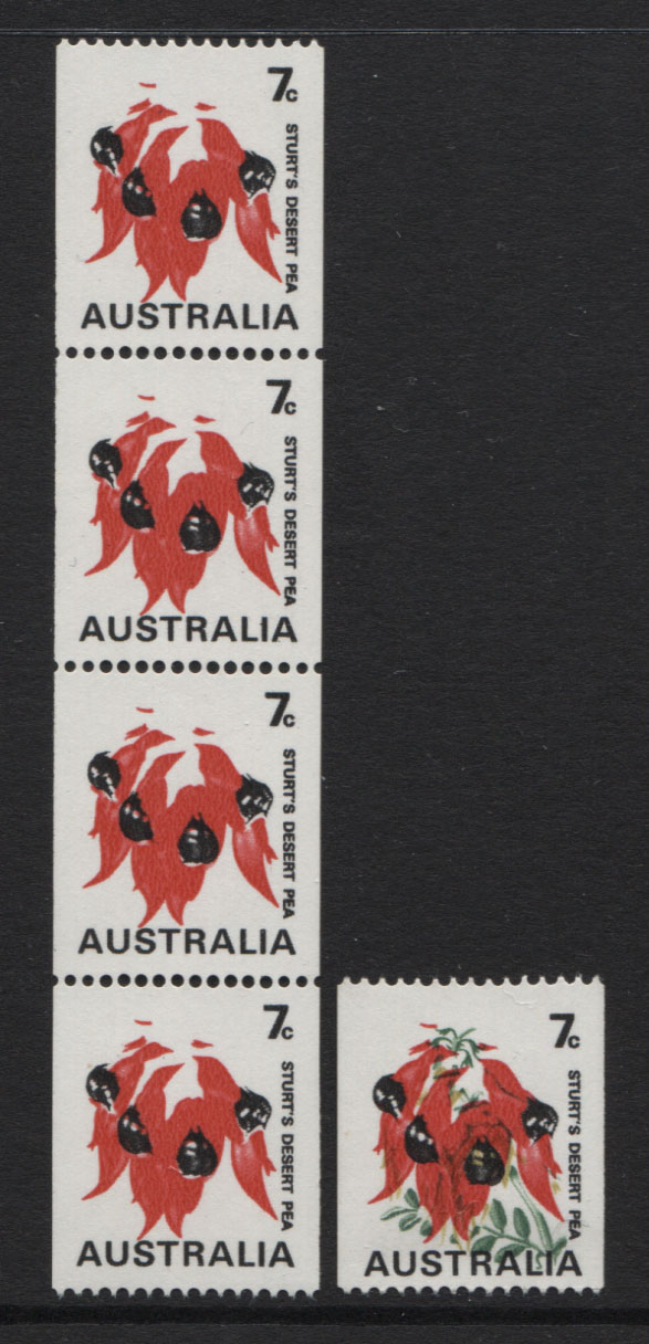 7¢ Sturt’s Desert Pea. Coil perf strip of 4 with BUFF AND GREEN completely omitted. Extra fine, mint unhinged.
