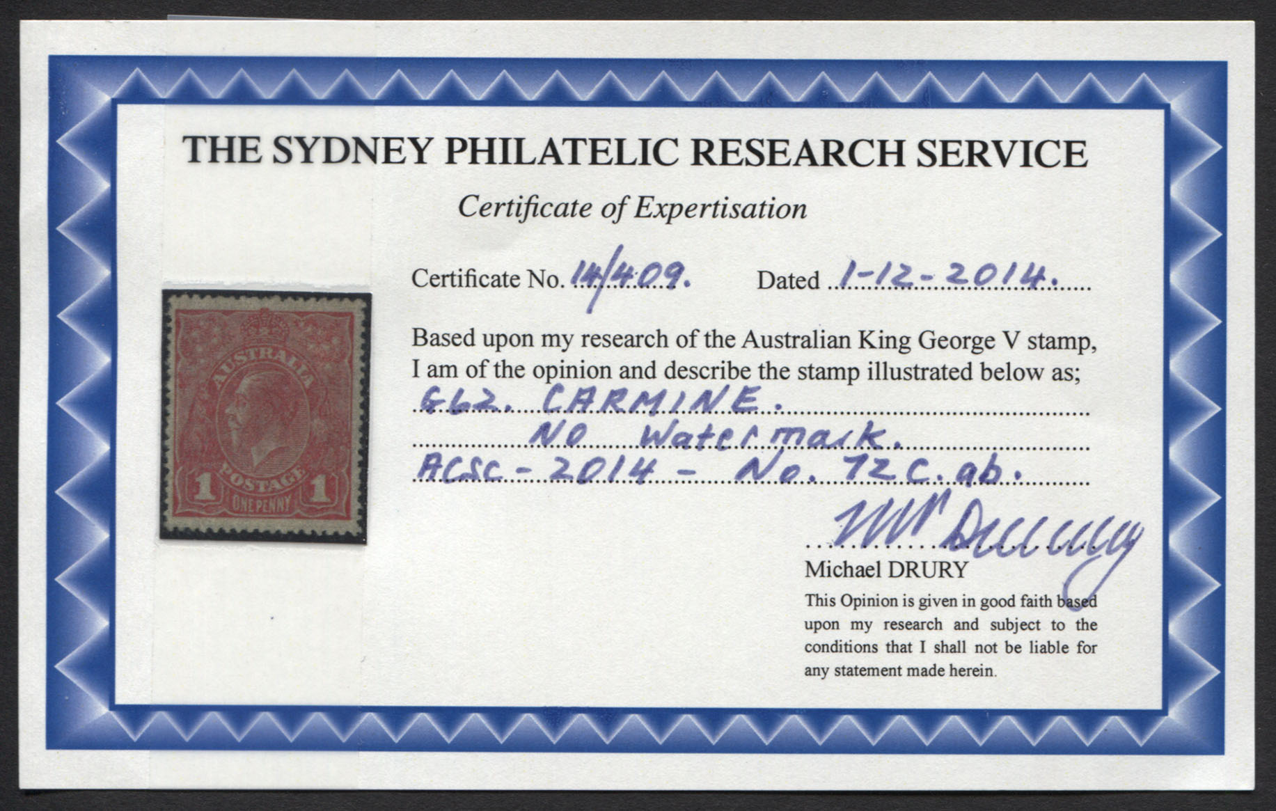 Single wmk, rough paper. 1d carmine, NO WATERMARK variety. (SG Cat £5,500). VERY RARE. Drury Certificate. Extra fine, mint lightly hinged.